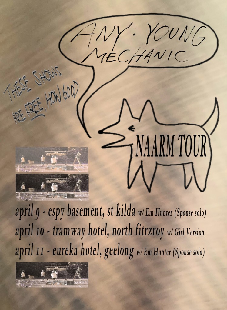 Back to rainy Melbourne, I’m slowly settling into a routine again, it’s been nice slowly putting down some more solid roots here, and I feel more myself and at home here these days. I’m playing guitar alot, and doing repairs again, as well as seeing friends and working. I also have my first solo sets coming up this week – both with Any Young Mechanic! They’re free, the poster is below if I did it right.